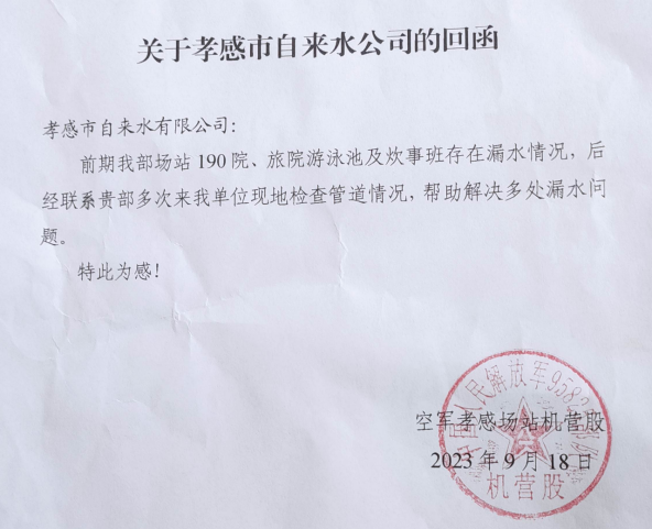 除此之外,再與工作人員的溝通中我們得知,該院內(nèi)新建的一處游泳池一直無(wú)法通水,秉持著讓用戶滿意的服務(wù)理念,我公司技術(shù)人員馬不停蹄義務(wù)幫助其查明原因,恢復(fù)正常通水,解決了用戶的各種用水問(wèn)題。事后,為了感謝我公司高效率高質(zhì)量的為民服務(wù),空軍孝感廠站機(jī)營(yíng)股工作人員特意送來(lái)了感謝信。